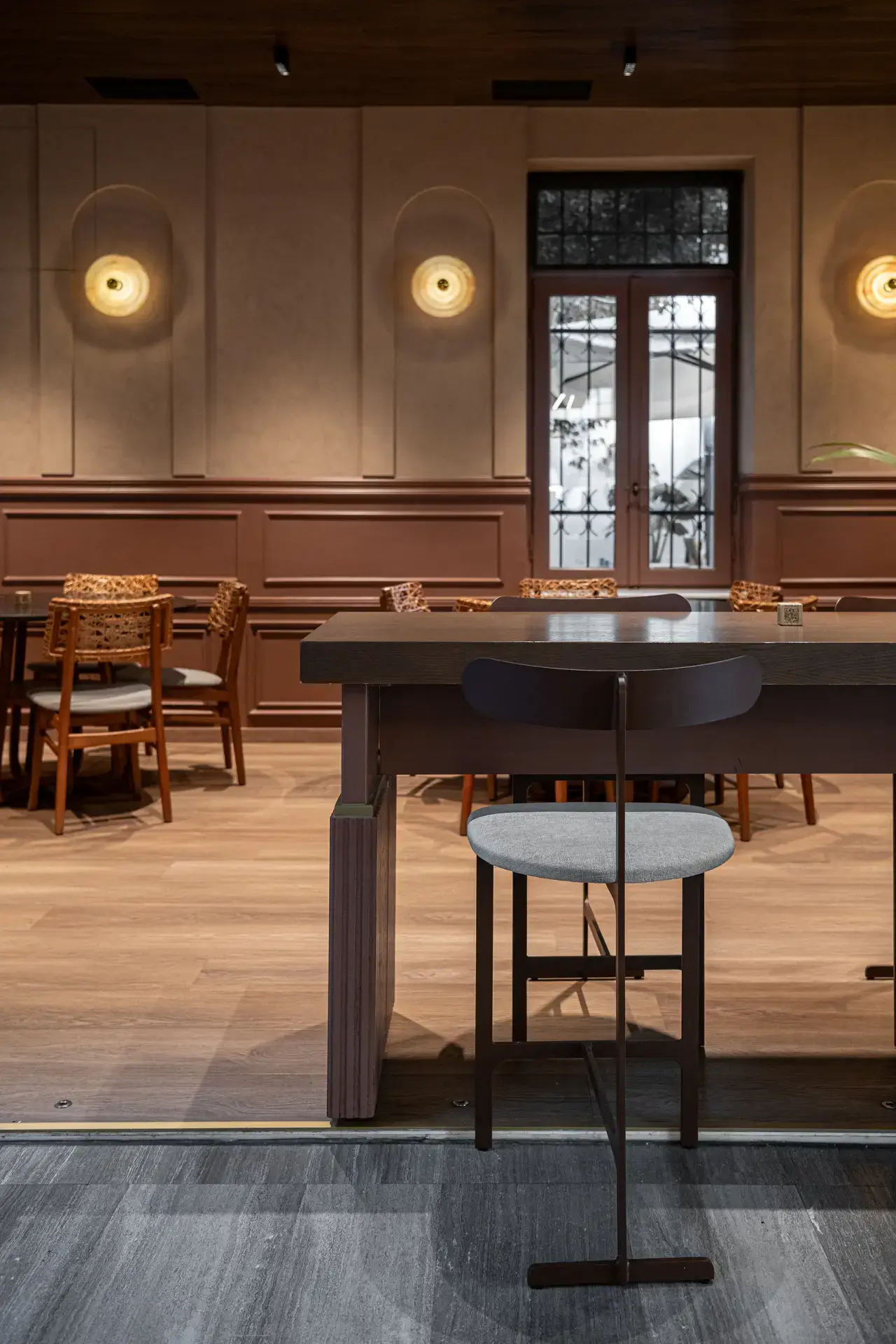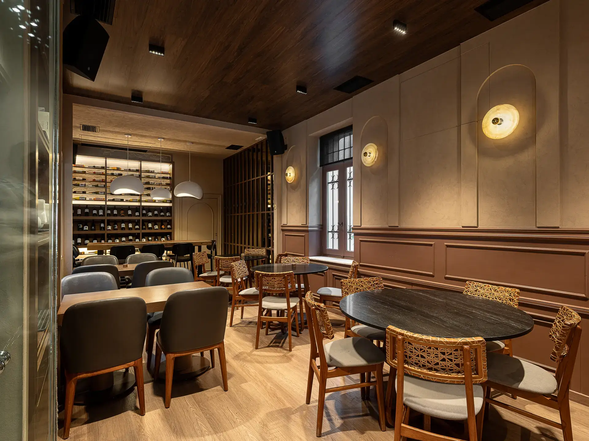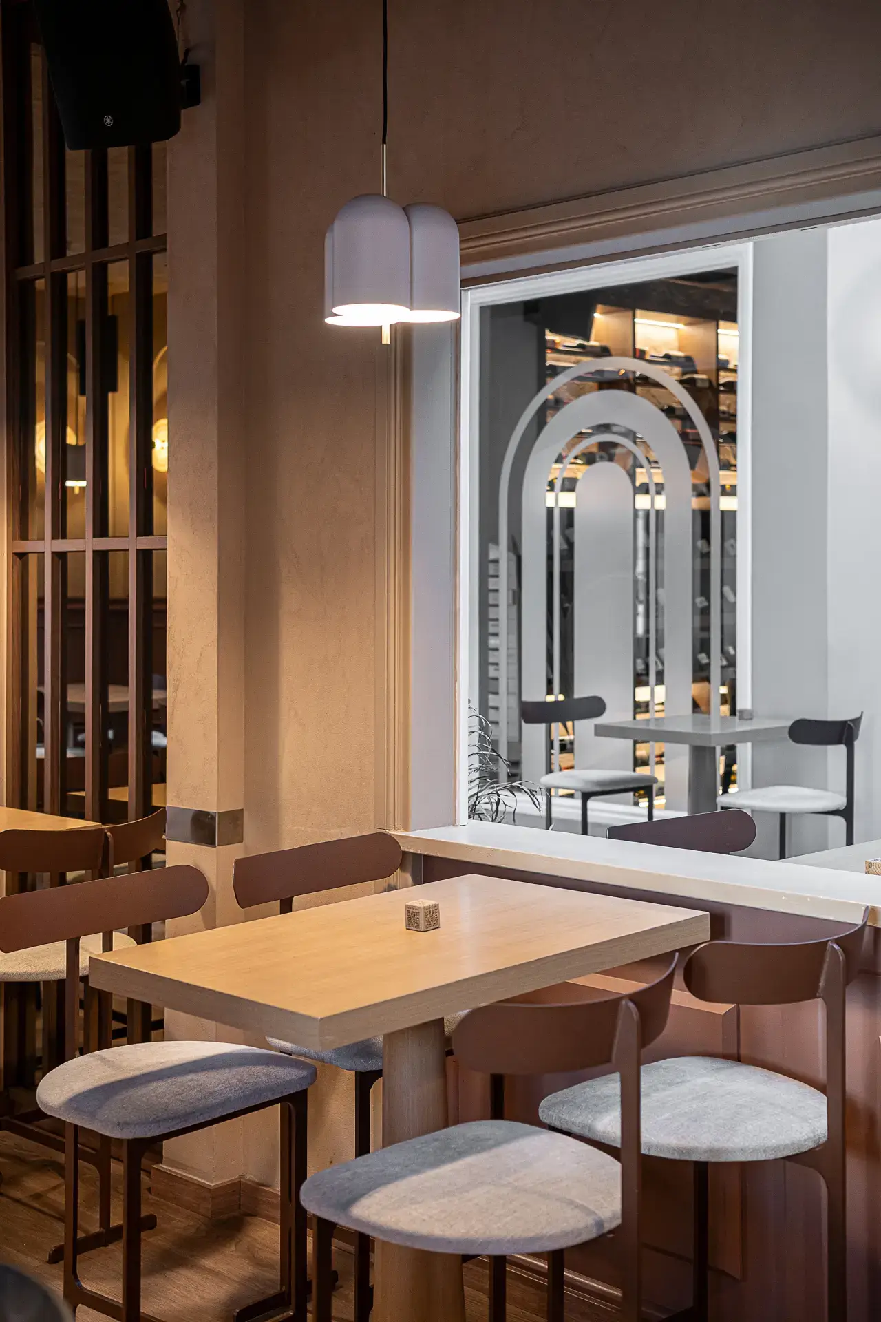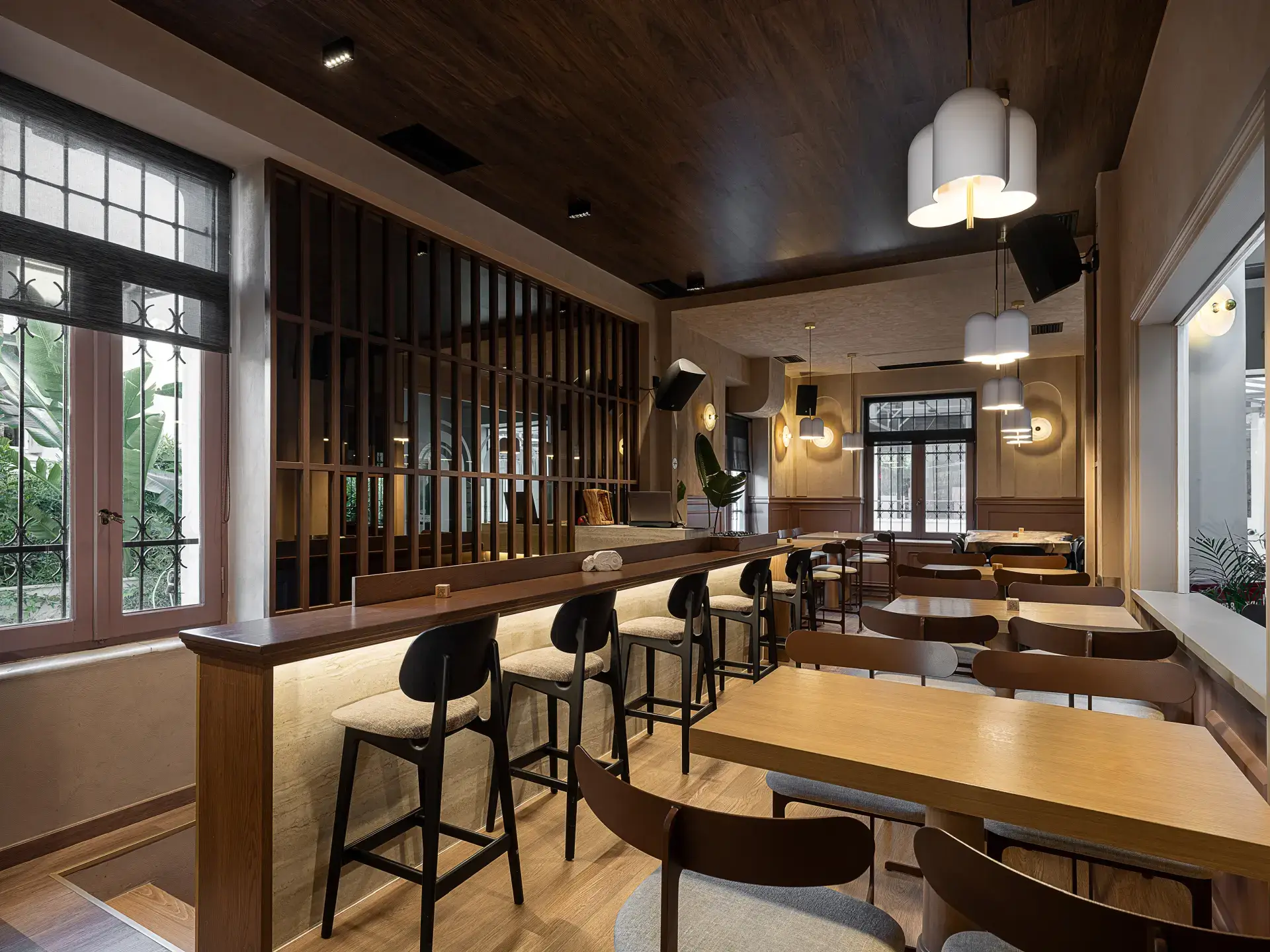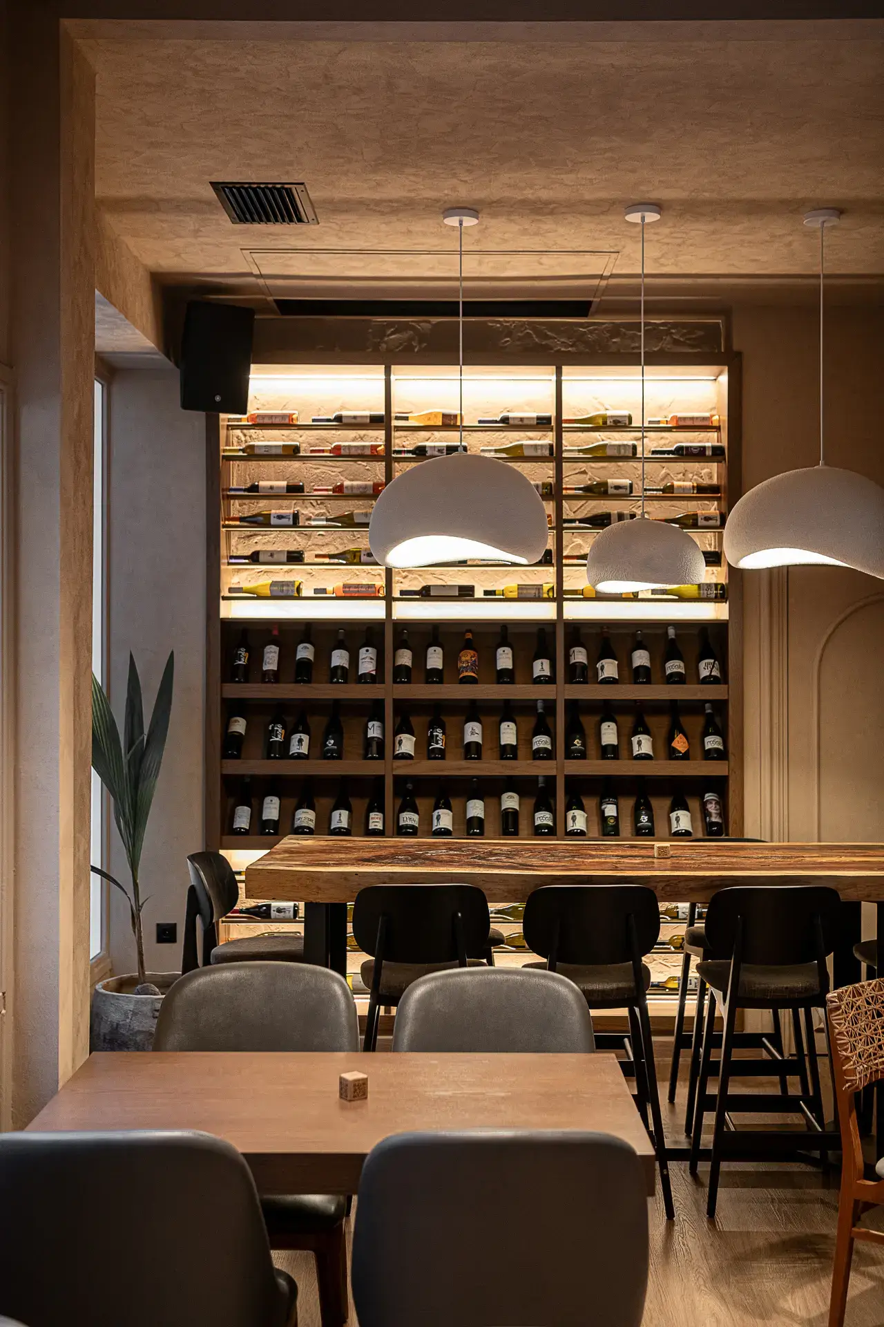 Ξύλο, μέταλλο και φυσικές υφές κυριαρχούν, συνθέτοντας ένα περιβάλλον που μεταβάλλεται διακριτικά μέσα στη μέρα. Το ξύλο κυριαρχεί στο δάπεδο και στην οροφή, προσφέροντας μια αίσθηση φυσικής συνέχειας, που ζεσταινει τον χώρο.