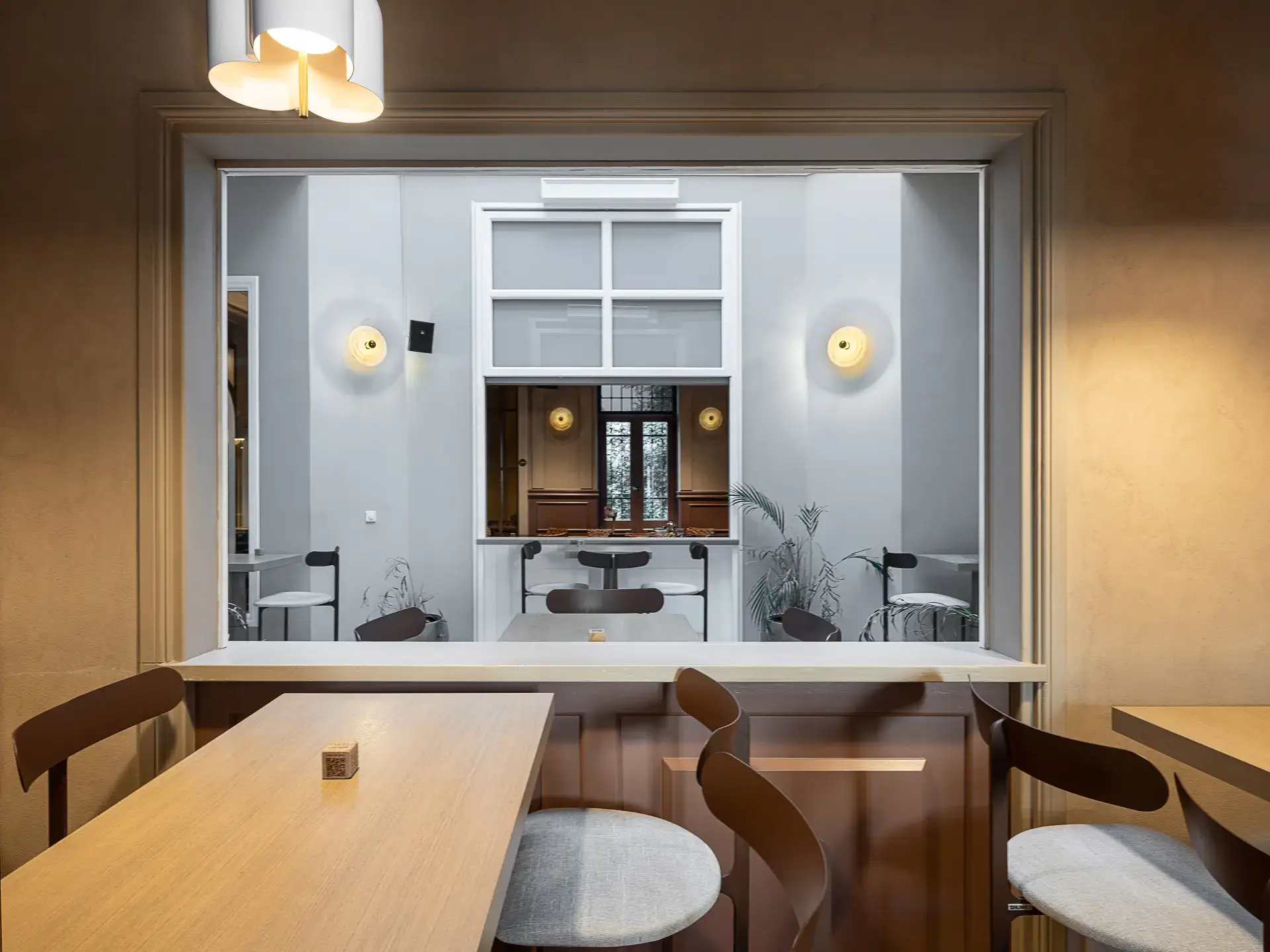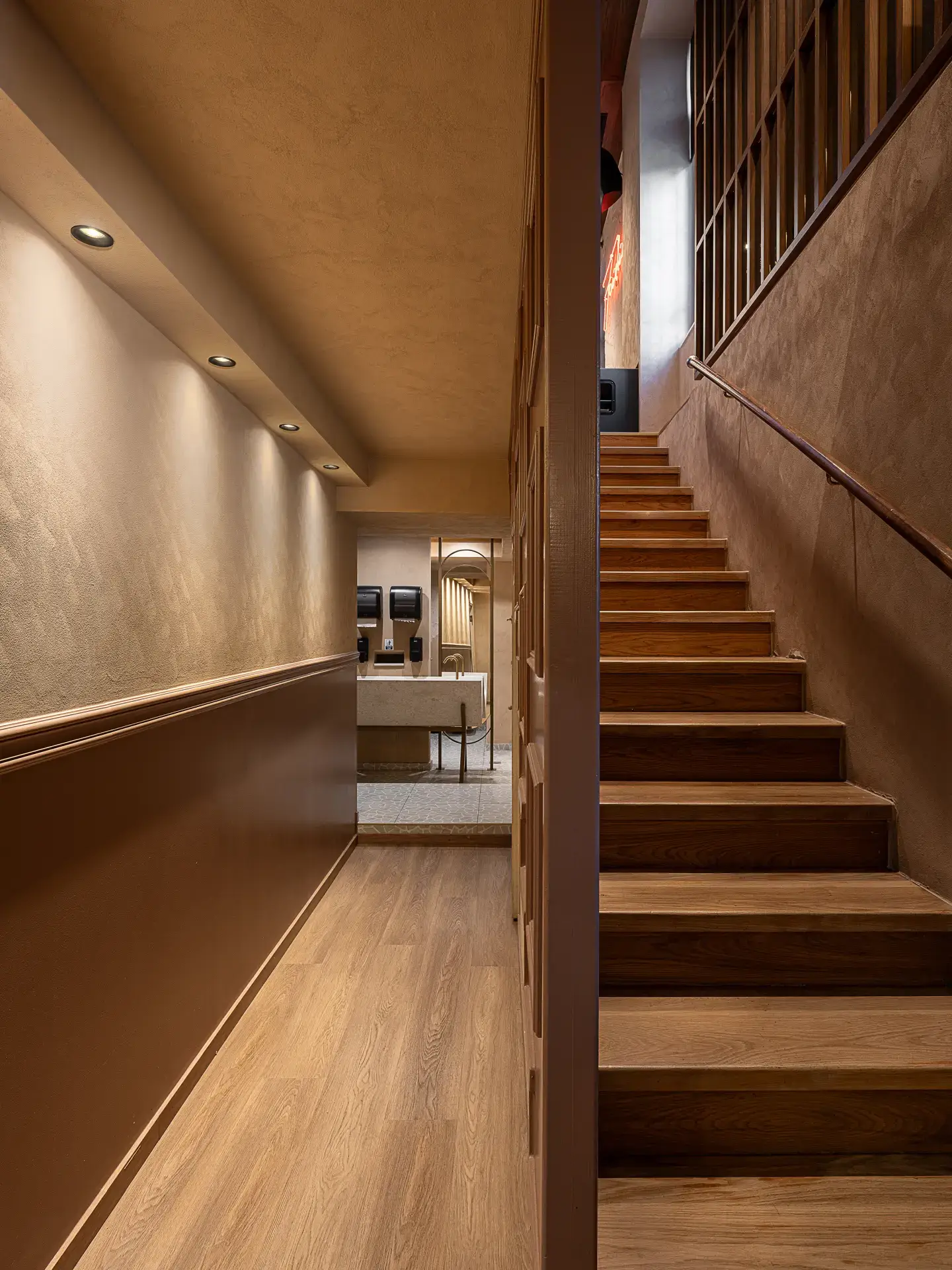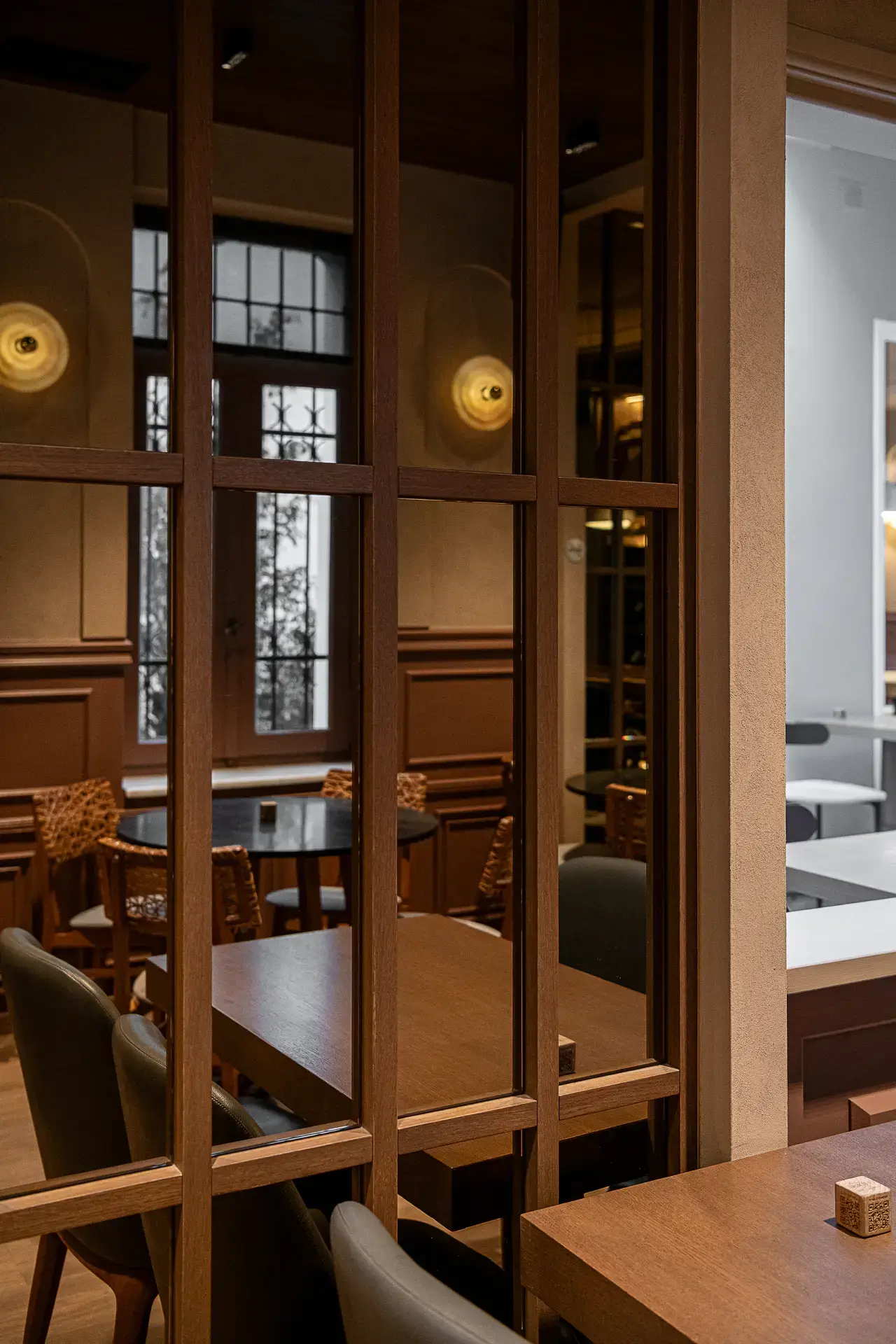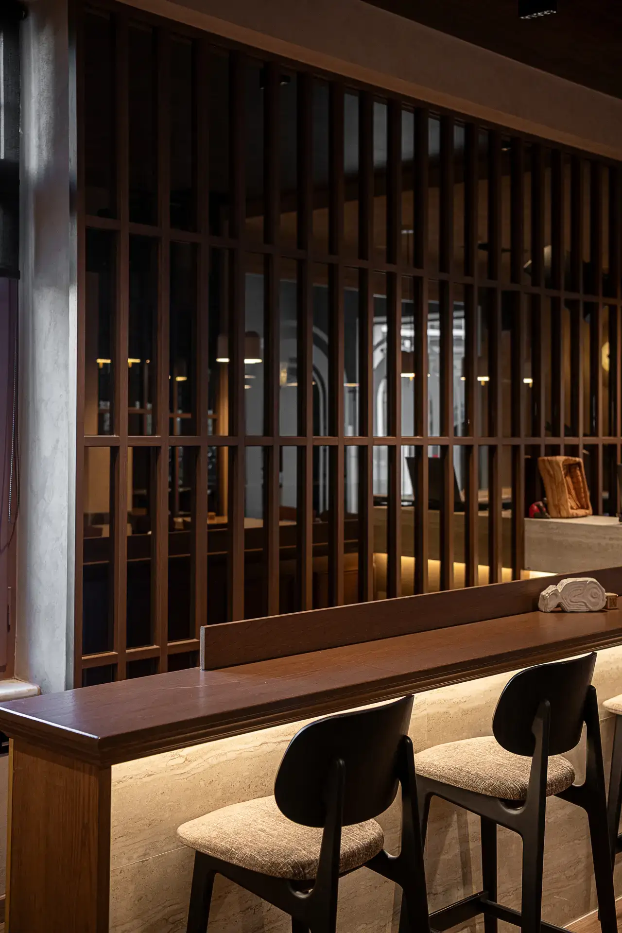 Ξύλο, μέταλλο και φυσικές υφές κυριαρχούν, συνθέτοντας ένα περιβάλλον που μεταβάλλεται διακριτικά μέσα στη μέρα. Το ξύλο κυριαρχεί στο δάπεδο και στην οροφή, προσφέροντας μια αίσθηση φυσικής συνέχειας, που ζεσταινει τον χώρο.