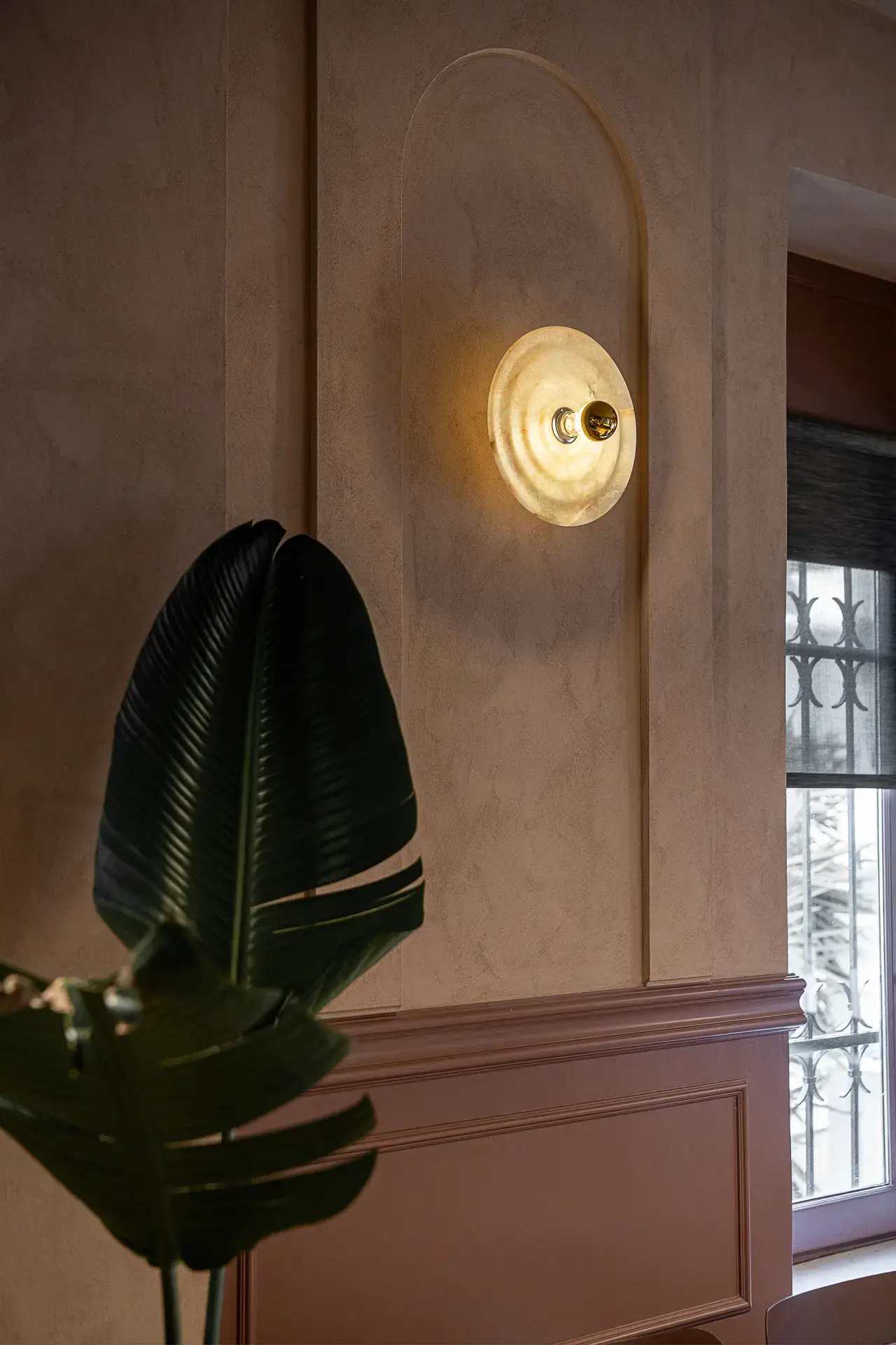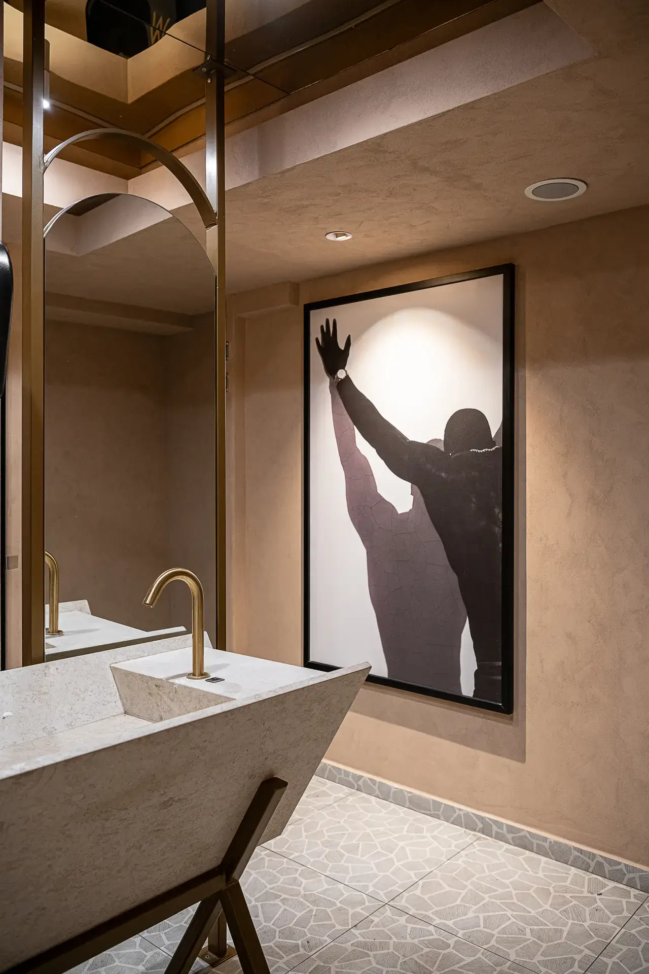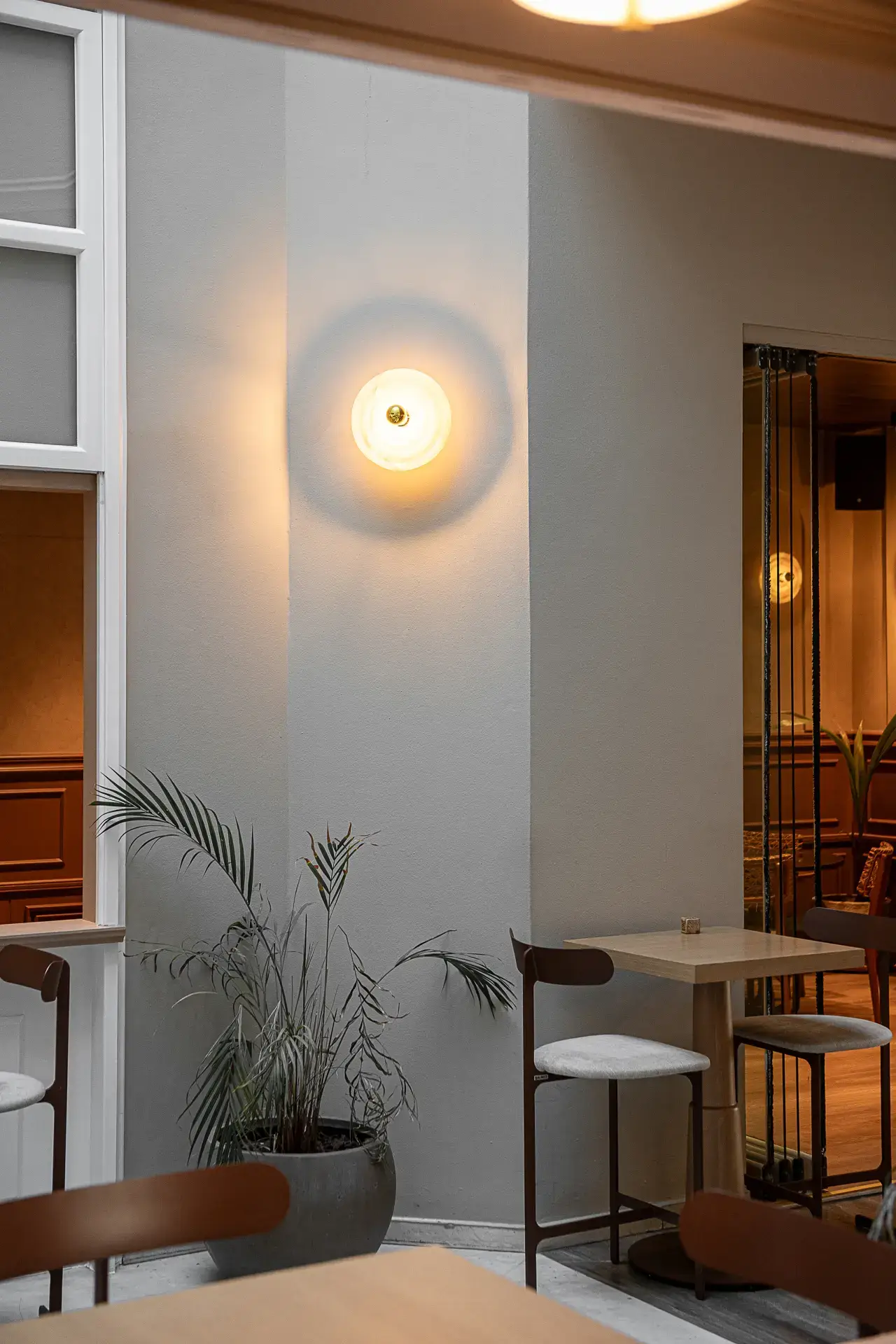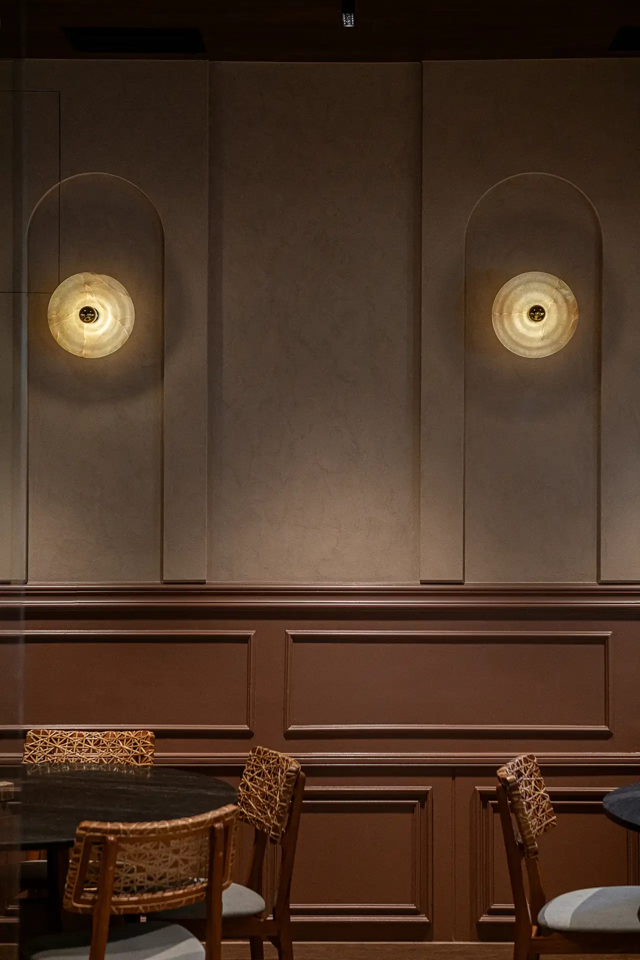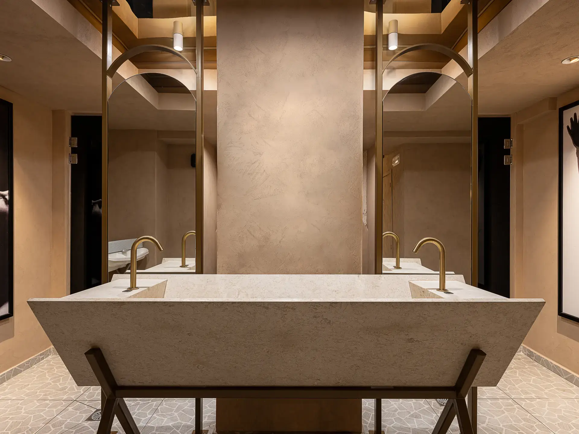 Ξύλο, μέταλλο και φυσικές υφές κυριαρχούν, συνθέτοντας ένα περιβάλλον που μεταβάλλεται διακριτικά μέσα στη μέρα. Το ξύλο κυριαρχεί στο δάπεδο και στην οροφή, προσφέροντας μια αίσθηση φυσικής συνέχειας, που ζεσταινει τον χώρο.