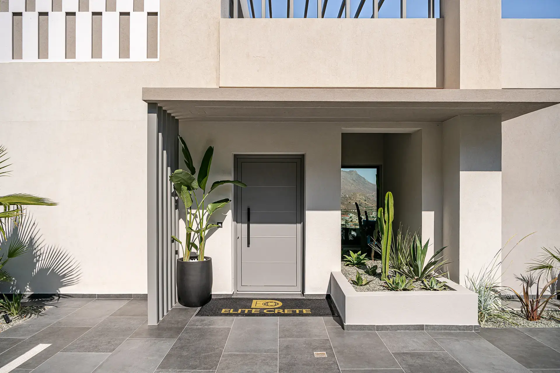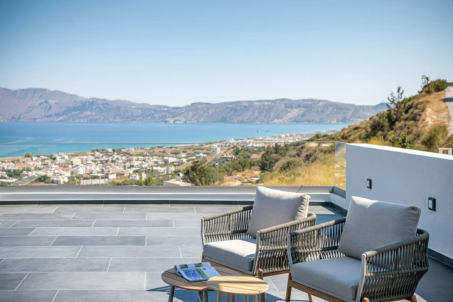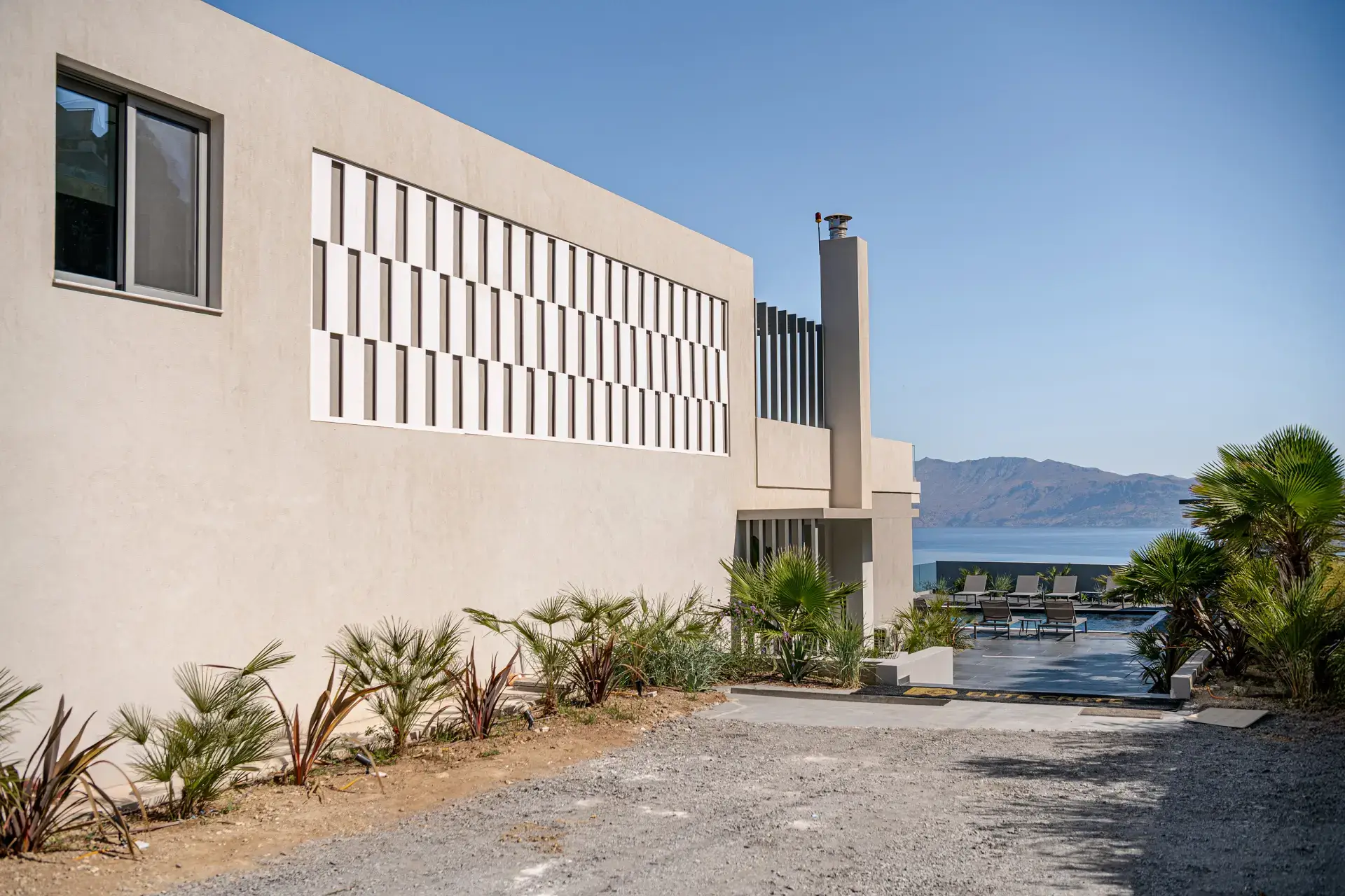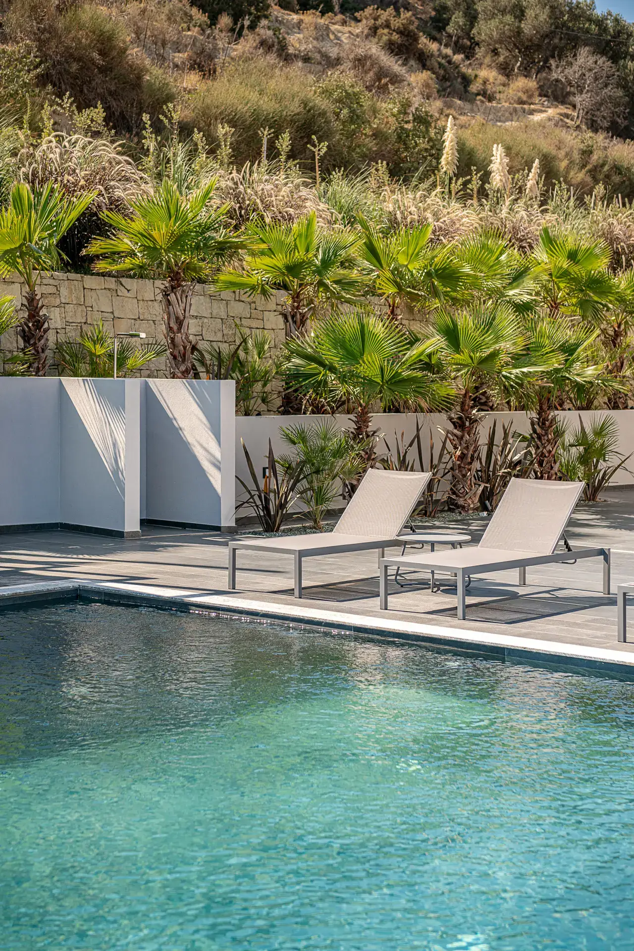 Ο εξωτερικός χώρος λειτουργεί ως φυσική προέκταση της κατοικίας. Η πισίνα των 75 τ.μ. τοποθετείται στρατηγικά ώστε να δημιουργεί την αίσθηση αιώρησης πάνω από το τοπίο, ενώ οι χώροι BBQ, η εξωτερική τραπεζαρία και οι ζώνες χαλάρωσης οργανώνονται γύρω από τη θέα, προσφέροντας μια εμπειρία διαμονής που συνδυάζει ιδιωτικότητα, άνεση και άμεση σύνδεση με το περιβάλλον.