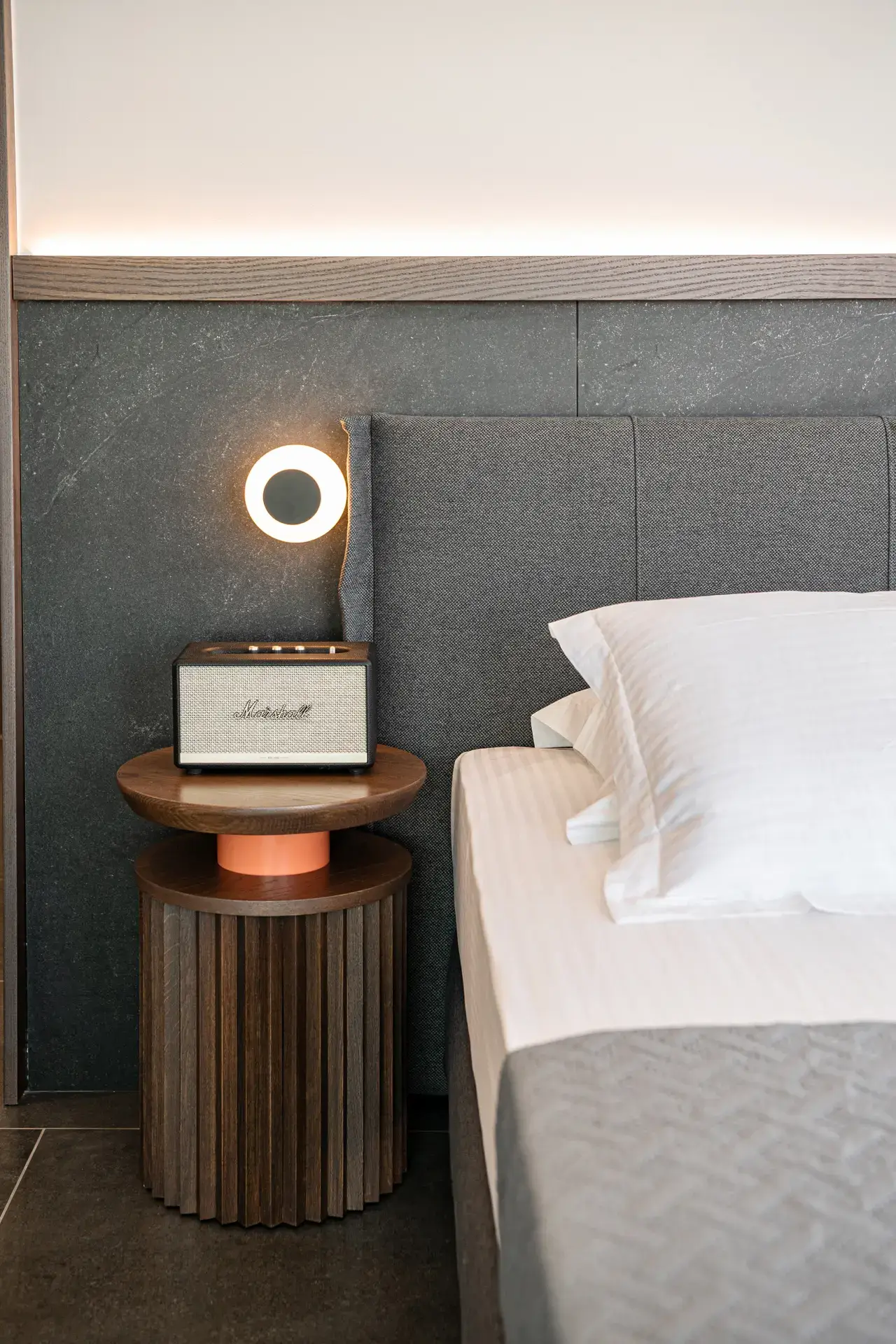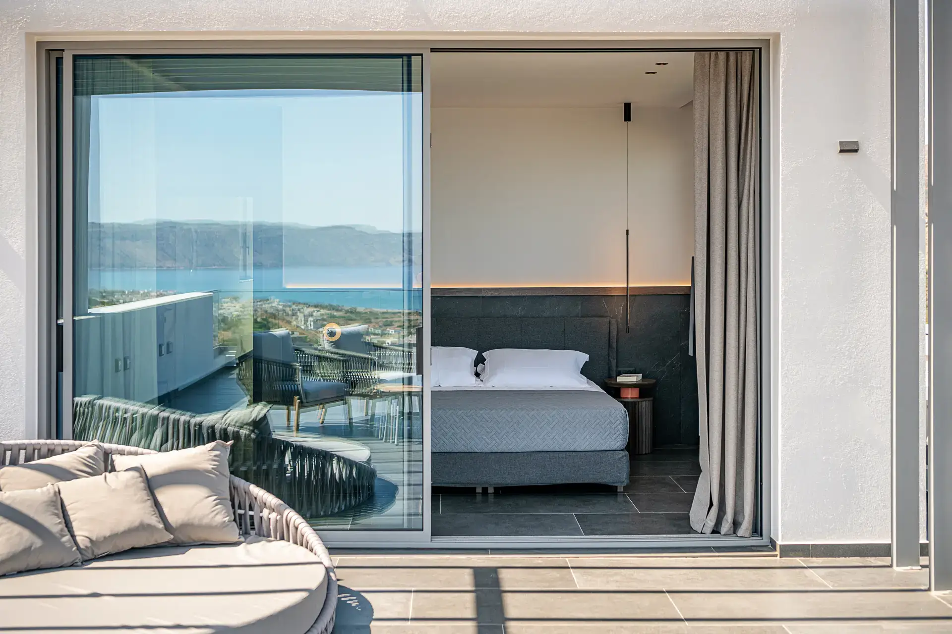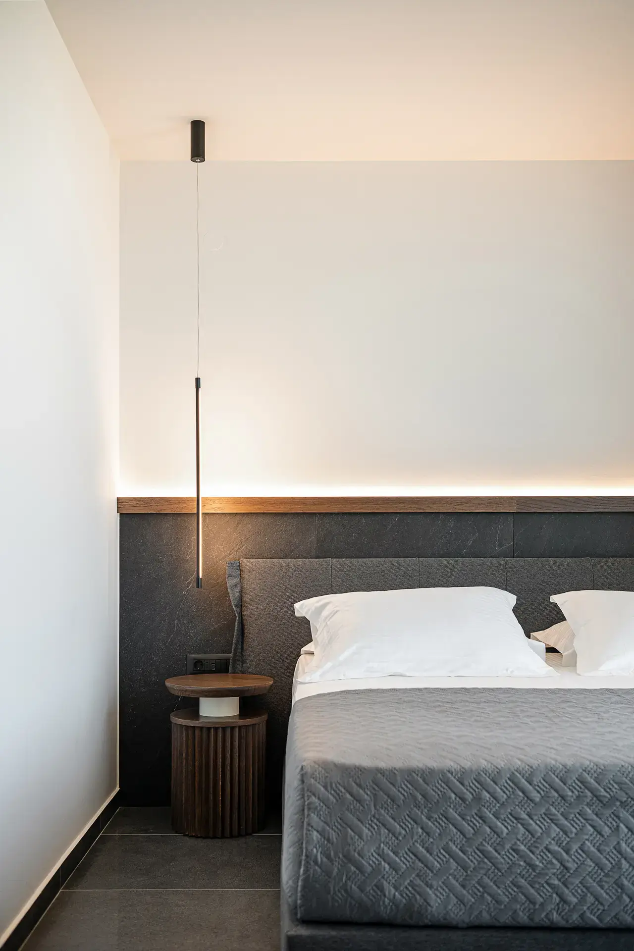 Στα υπνοδωμάτια οι επενδύσεις στα κεφαλάρια με τα ίδια πλακίδια του δαπέδου δημιουργούν μια αίσθηση συνέχειας, ενώ τα custom-made έπιπλα και τα προσεκτικά επιλεγμένα φωτιστικά ενισχύουν το μινιμαλιστικό χαρακτήρα με μια διακριτική πολυτέλεια.