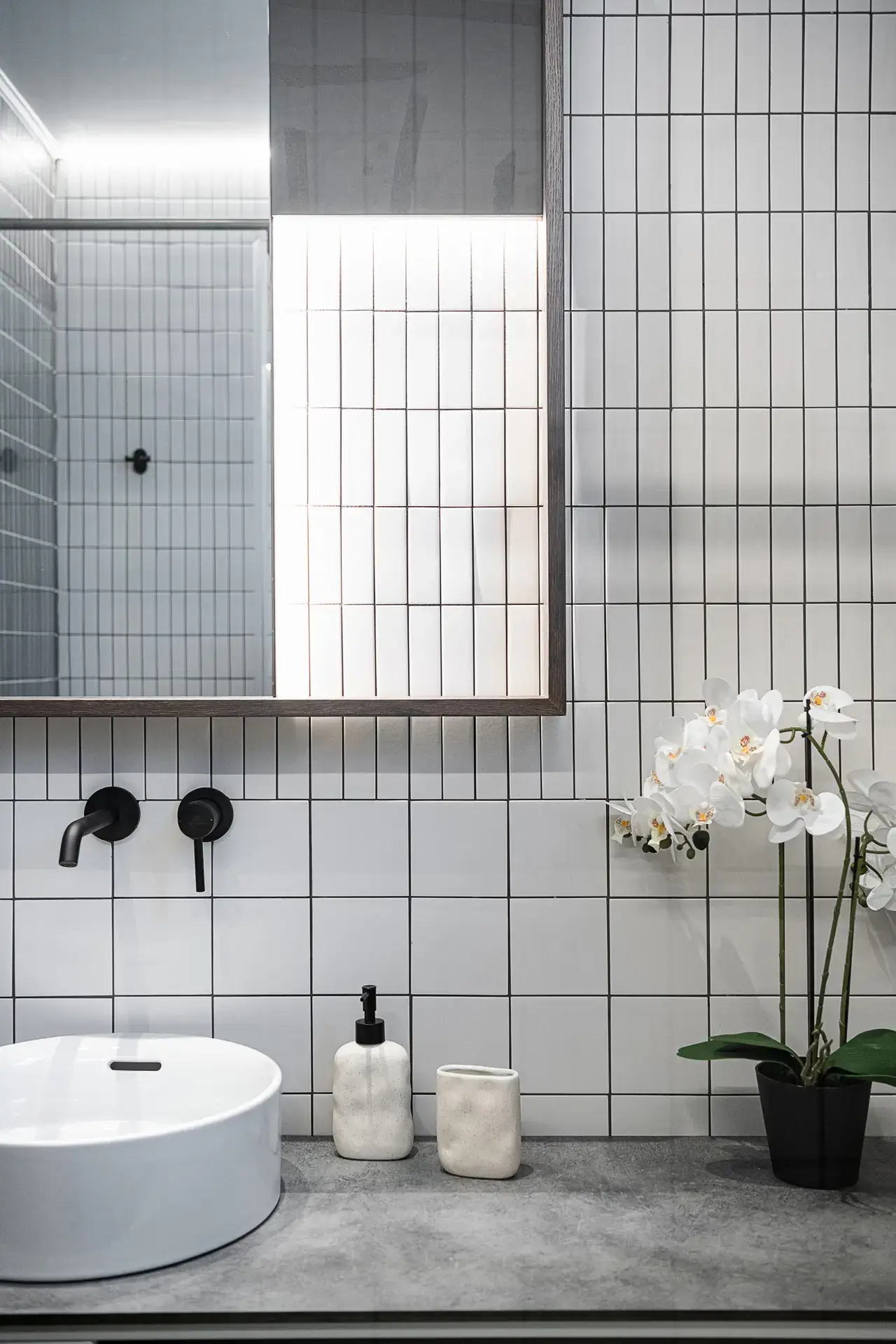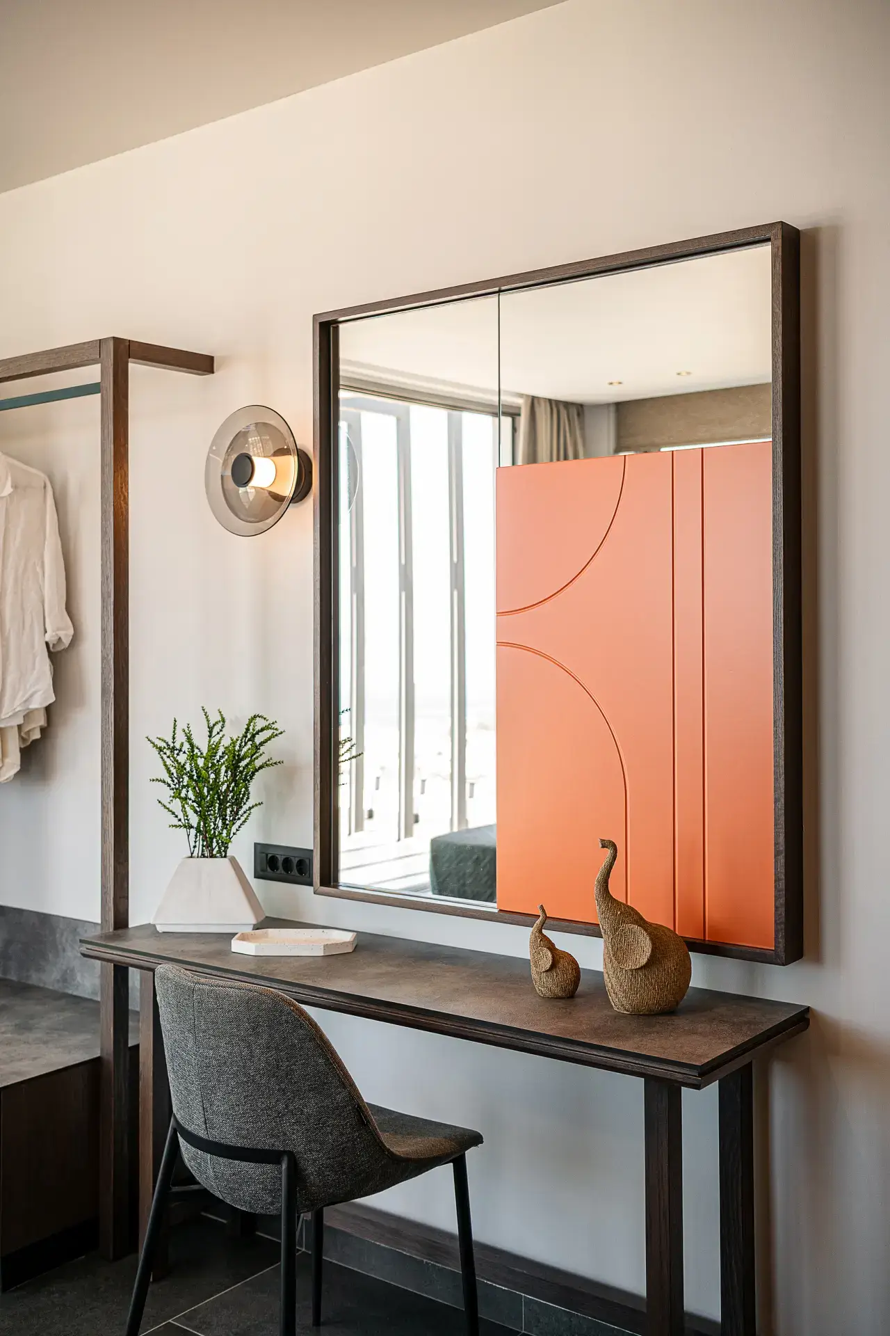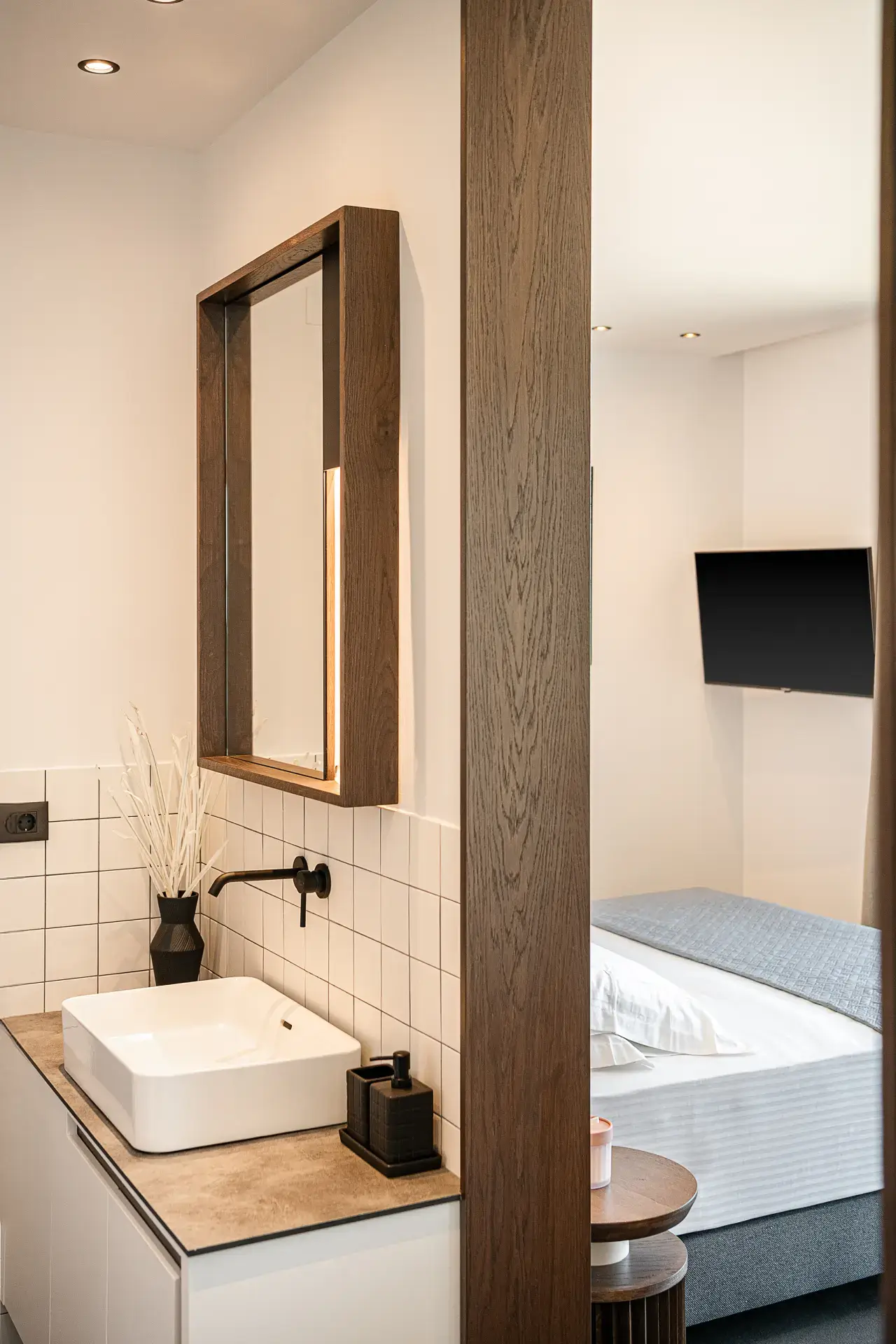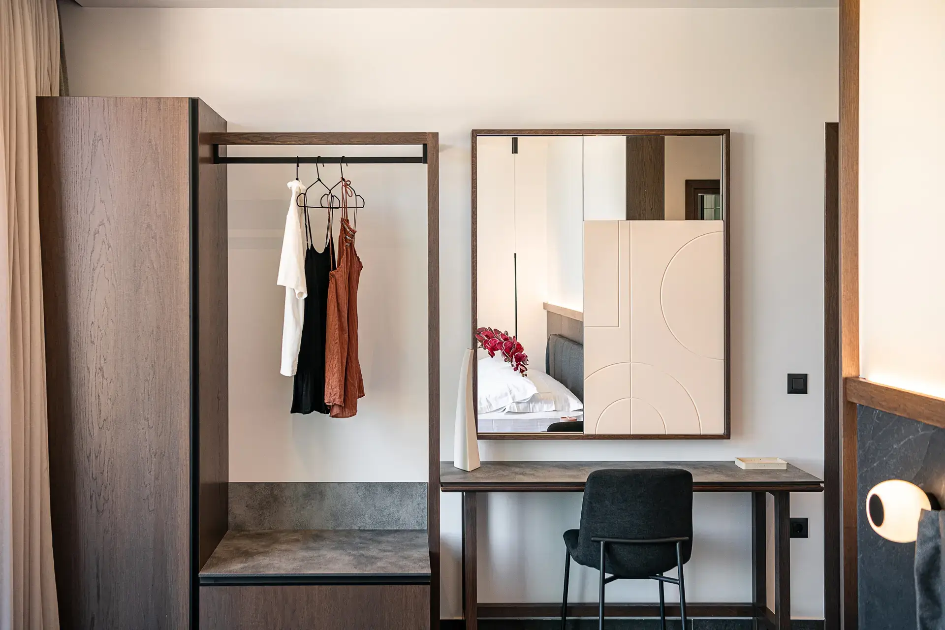Στα υπνοδωμάτια οι επενδύσεις στα κεφαλάρια με τα ίδια πλακίδια του δαπέδου δημιουργούν μια αίσθηση συνέχειας, ενώ τα custom-made έπιπλα και τα προσεκτικά επιλεγμένα φωτιστικά ενισχύουν το μινιμαλιστικό χαρακτήρα με μια διακριτική πολυτέλεια.