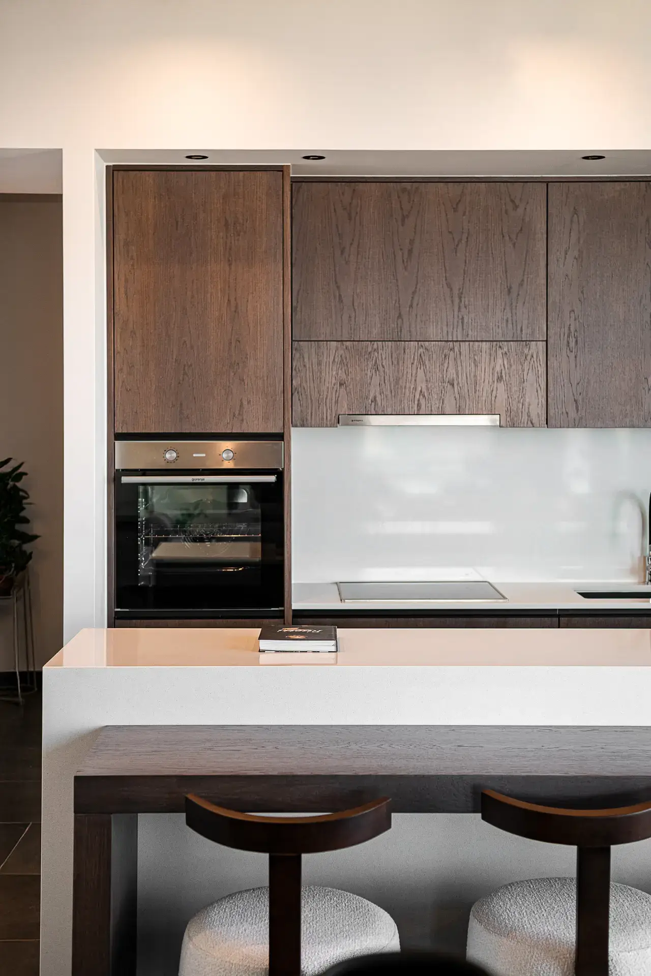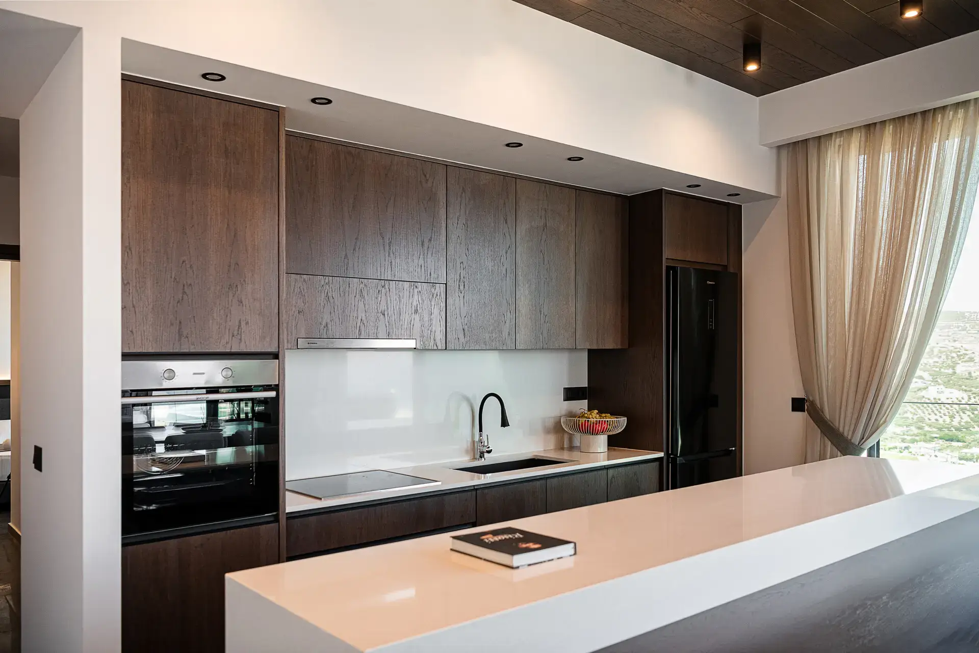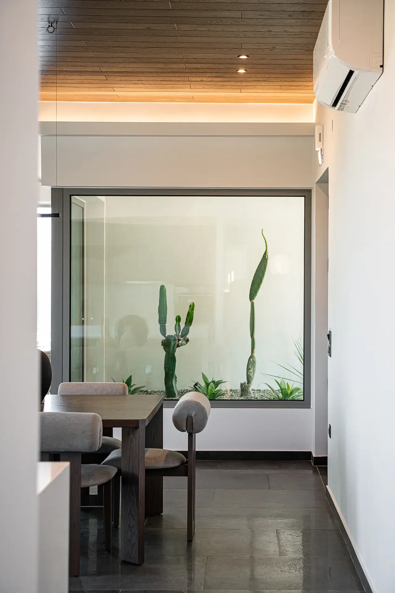 Η εσωτερική διακόσμηση αναδεικνύει ένα ισορροπημένο παιχνίδι αντιθέσεων. Το σκούρο δάπεδο, που παραπέμπει σε φυσική πέτρα, και οι επενδύσεις οροφής από σκούρο ξύλο συνθέτουν ένα στιβαρό, ενοποιητικό υπόβαθρο το οποίο αντιπαραβάλλεται με τις ανοιχτές, θερμές αποχρώσεις των τοίχων. Το κεντρικό τζάκι λειτουργεί ως στοιχείο οργάνωσης του χώρου, διαχωρίζοντας διακριτικά τις επιμέρους χρήσεις, ενώ η επένδυσή του με το ίδιο υλικό του δαπέδου ενισχύει τη συνοχή της σύνθεσης.